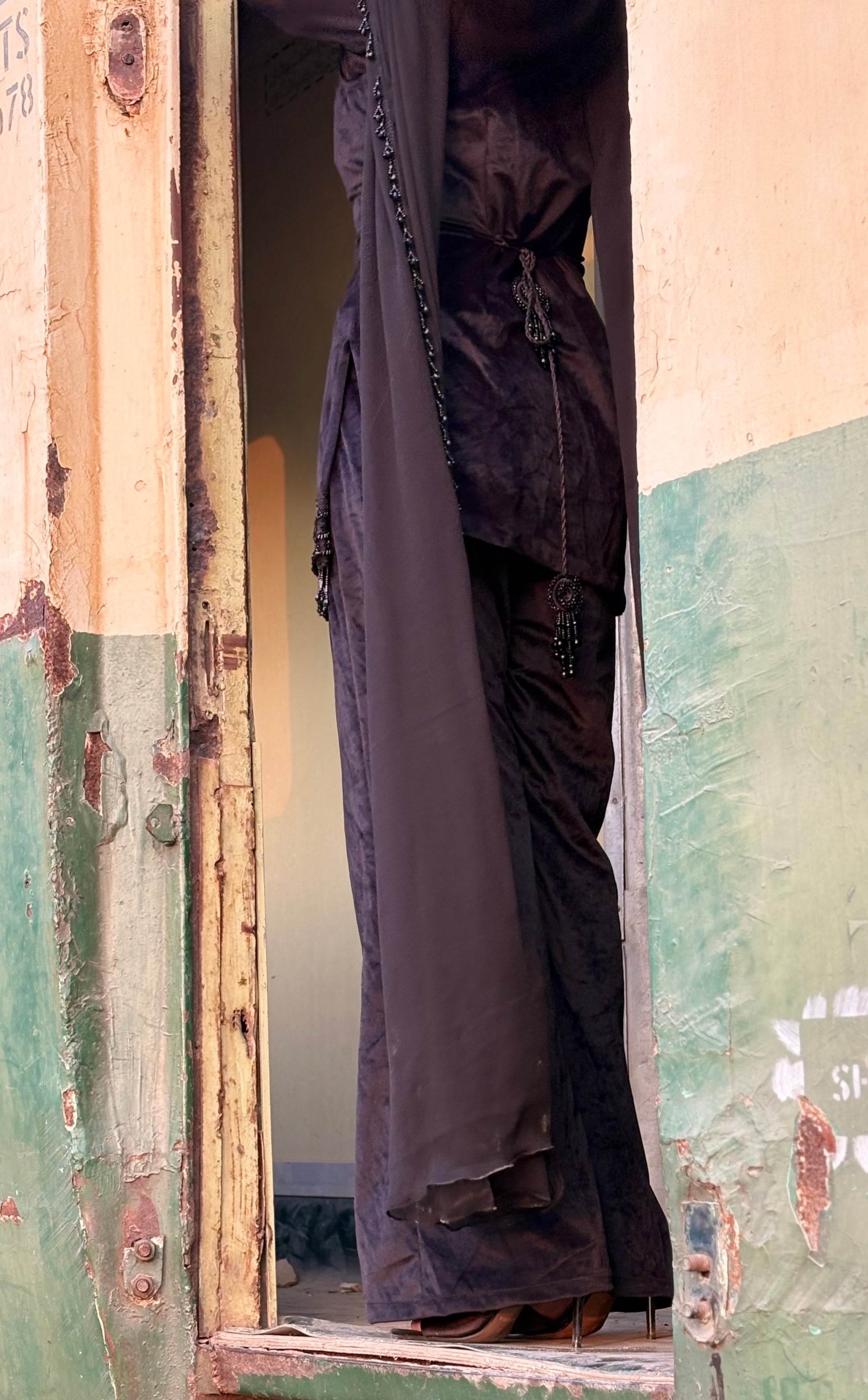 The outfit features a luxuriously soft velvet shirt and trouser, paired with a lightweight georgette dupatta that flows beautifully with every step.